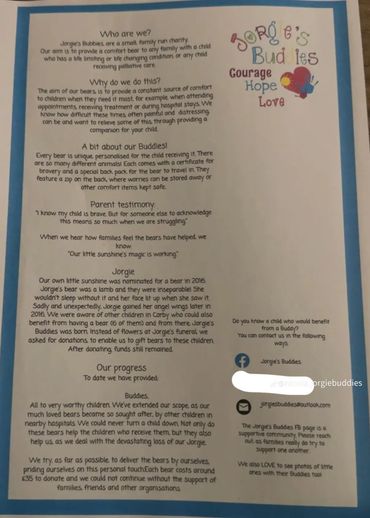 At Jorgie's Buddies, we are dedicated to providing comfort bears to children facing life-limiting conditions. Our mission is to bring solace and support to families during their most challenging times.